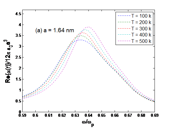 Let us present some numerical results obtained from the above-listed formalism. First, we present some results similar to those in Ref. [15] to show how the plasmon is shifted with the quantum-size effect and temperature. The reference for the plasmon is the standard Gaussian peak for Raylagh particles, i.e., the quantum size effects are not considered. The spectrum is normalized to the peak frequency, i.e., the plasmon. Since the theory is universally useful for all conducting materials, the selection of actual plasmon frequency is conserved. Note that for a material with a plasmon frequency of 500 nm, a shift of means 5 nm. Modern high-resolution optical microscopes can easily pick up frequency shifts of < 0.1 nm.