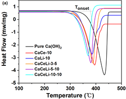 Fig. 1: (a) DSC curves of Ca(OH)2 and CaCeLi-x-y. (b) dehydration-temperature changes of CaCeLi-x-y with contents.