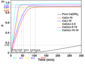 The effect of Ce(NO3)3 and LiOH on the thermal storage of Ca(OH)2 can be further examined with isothermal dehydration methods using TG technology. The samples are heated at 20 °C/min until 310 °C, this temperature is then maintained for 300 min, and the weight loss is recorded. The conversion (α) is calculated with (m0-mt)/mH2O (mt is the sample mass at time t/min, mH2O is the theoretical mass of water in the sample, and m0 is the initial mass of the sample.). Figure 2b shows the relationship between α of the isothermal dehydration and the heat-storage time (t/min).